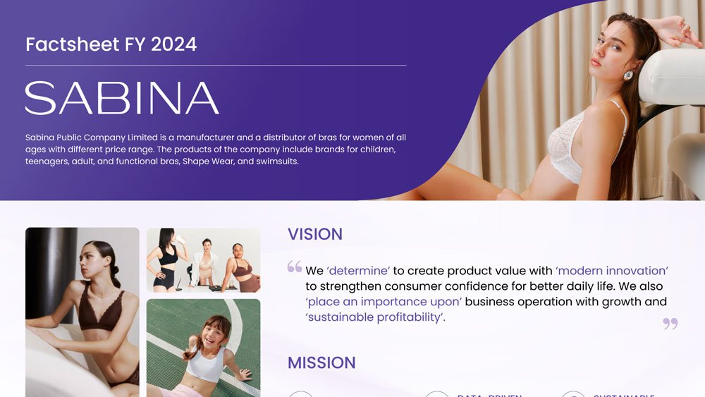 Sabina Public Company Limited or Sabina, a manufacturer and distributor of ladies' lingerie, top number one lingerie brand in Thailand.